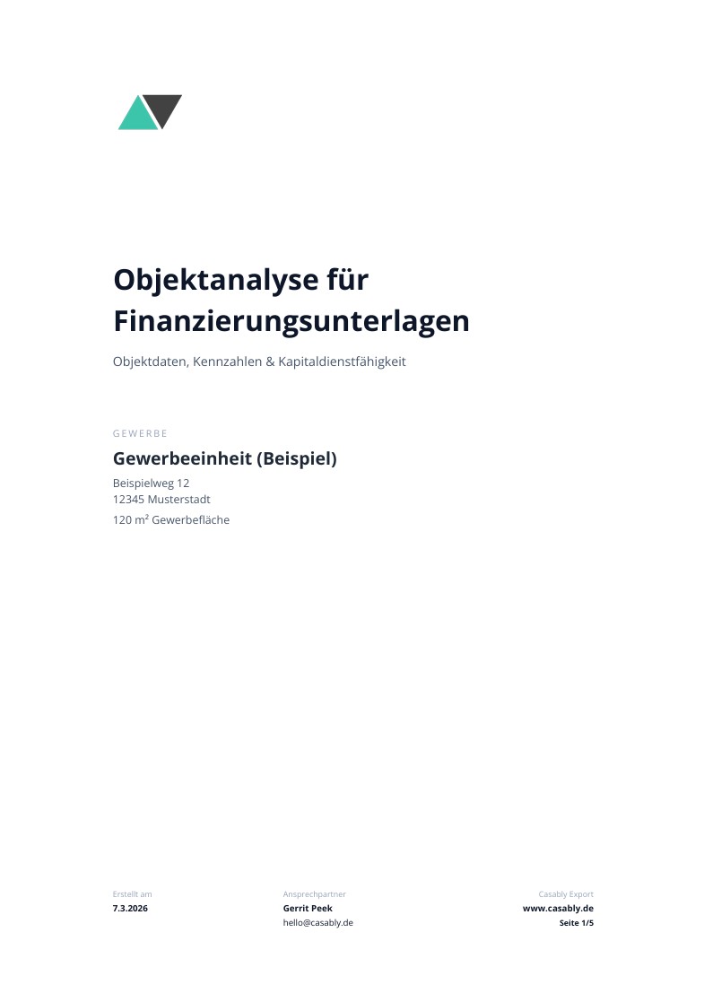 Bewahre eine saubere Analyse jedes Objekts auf – für deine Unterlagen, Due Diligence oder als Anlage zu Serienbriefen bei mehreren Banken.