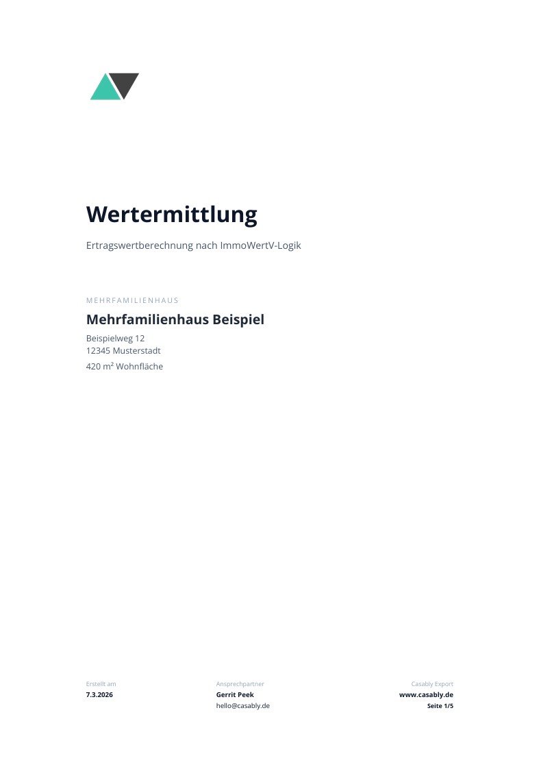 Die Berechnung ist angelehnt an die ImmoWertV-Logik und nutzt dieselbe Struktur (Ertragswertverfahren). Es handelt sich nicht um eine offizielle Wertermittlung nach ImmoWertV.
